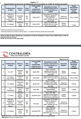La Contraloría General de la República, a través del Informe de Control N° 017-2024-OCI/4190-SCV, advirtió que los establecimientos de Salud de la Dirección Subregional de Salud Luciano Castillo Colonna no cuentan con ambulancias, debido a que siete de estos vehículos permanecen, desde hace 15 meses, en un taller de mecánica. Según el informe de control, otras dos camionetas pasan por la misma situación.