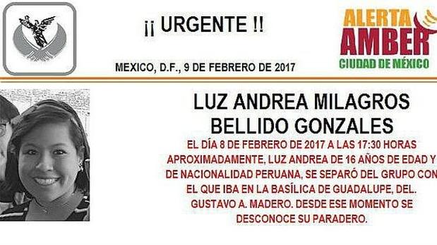 Se trata de Luz Andrea Bellido Gonzáles, de 16 años, quien desapareció el pasado 8 de febrero en la Basílica de la Virgen de Guadalupe en México, cuando hacía un viaje de turismo con su familia.Al advertir su ausencia, sus padres dieron aviso a la Policía mexicana y se pusieron en contacto con la embajada peruana en la capital federal de México.