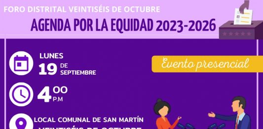 Las y los candidatos a la alcaldía distrital de Veintiséis de Octubre (VDO) expondrán sus propuestas para prevenir, sancionar y erradicar la violencia contra la mujer e integrantes del grupo familiar en el diálogo Agenda por la equidad. Dicho evento se llevará a cabo este lunes 19 a partir de las 4 de la tarde … Sigue leyendo Agenda por la equidad: Candidatas y candidatos de VDO expondrán propuestas para atender violencia y reducir brechas de género