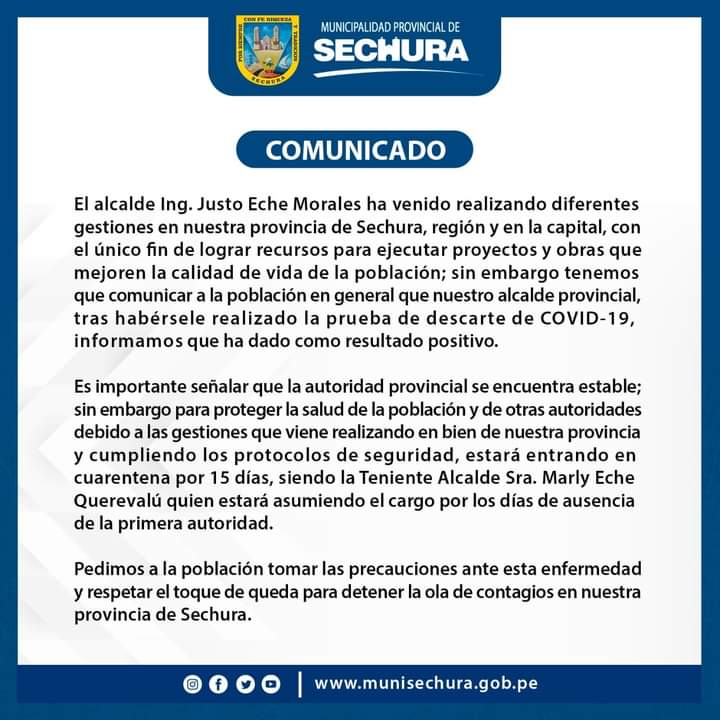 El alcalde de la provincia de Sechura (Piura), Justo Eche Morales, contrajo la Covid-19 por segunda vez. De acuerdo al comunicado de la Municipalidad Provincial de Sechura, el alcalde se encuentra estable y permanecerá aislado en su domicilio durante 15 días, cumpliendo las disposiciones de seguridad correspondientes.