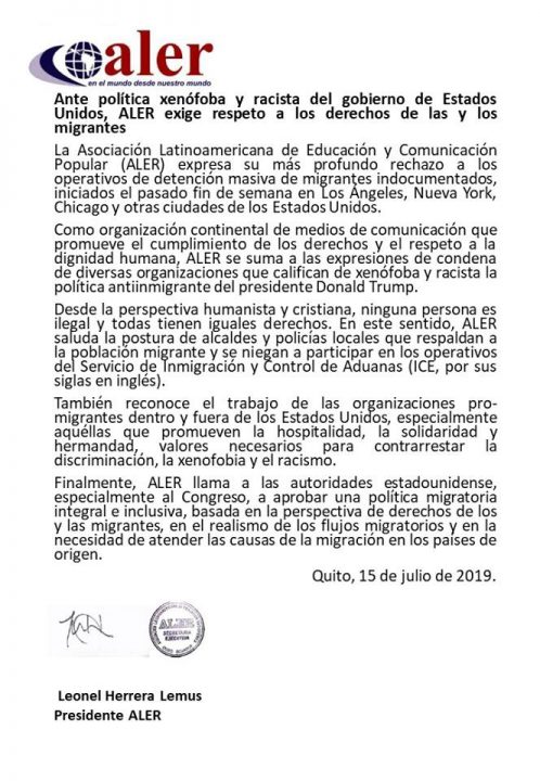 La Asociación Latinoamericana de Educacion Radiofonica (Aler) emite este comunicado donde rechaza las acciones y discursos que el gobierno de Donald Trump viene realizando contra las y los migrantes.