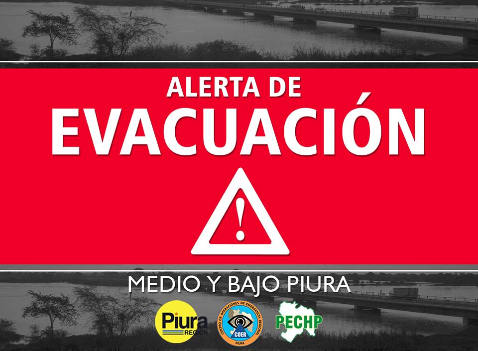 Advierten a la población del Medio y Bajo Piura que deben evacuar la zona a lo largo del día de hoy debido a la fuerte crecida del río Piura que se espera.