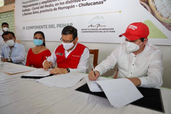 El gobernador regional Servando García Correa y el ministro de Agricultura y Riego, Jorge Montenegro Chavesta, firmaron el convenio para el financiamiento del expediente técnico del proyecto de mejoramiento y ampliación del sistema de riego La Gallega-Corral del Medio, en los distritos de Morropón y Buenos Aires (Morropón – Chulucanas).