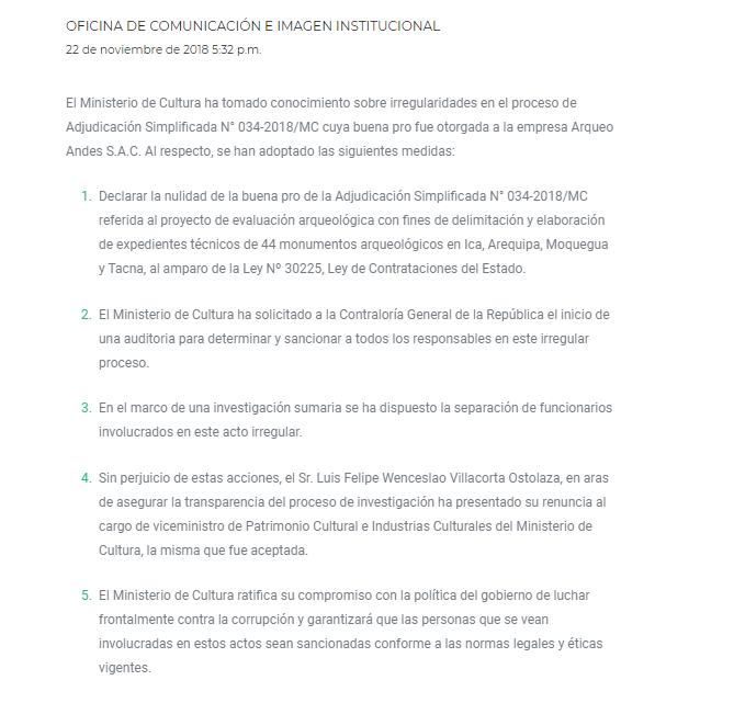 A través de un comunicado oficial, Balbuena anunció la anulación de la irregular adjudicación a la empresa Arqueo Andes S.A.C. y la renuncia de su entonces viceministro Luis Felipe Villacorta Ostolaza, accionista mayoritario de esa compañía.
