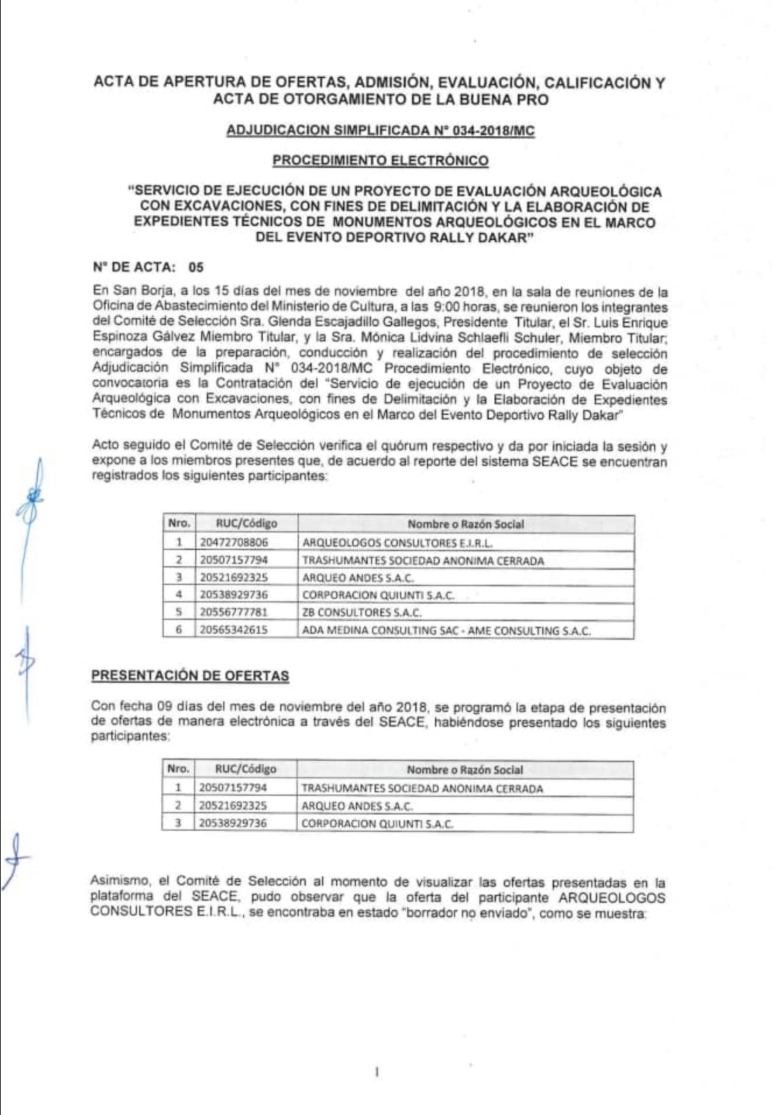 La historia empezó a conocerse el pasado jueves 15 de este mes, cuando la empresa Arqueo Andes ganó la buena pro para una evaluación arqueológica para el Rally Dakar con un costo total de 359 mil 337 soles. Entre las otras empresas que postularon al concurso estaba Trashumantes SAC, Corporación Quiunti SAC, ZB Consultares y ADA Medina Consulting SAC – AME Consulting SAC.