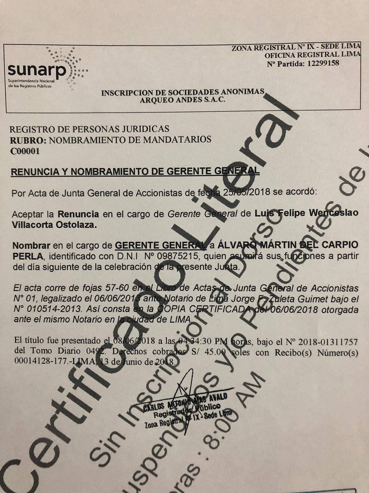 Pero Villacorta no sería el único alto funcionario dentro del Ministerio de Cultura vinculado a Arqueo Andes. La dirección de gestión de Monumentos está a cargo de la arqueóloga Paloma Manrique Bravo, esposa de Alvaro del Carpio Perla, actual gerente de Arqueo Andes y primo de Villacorta.