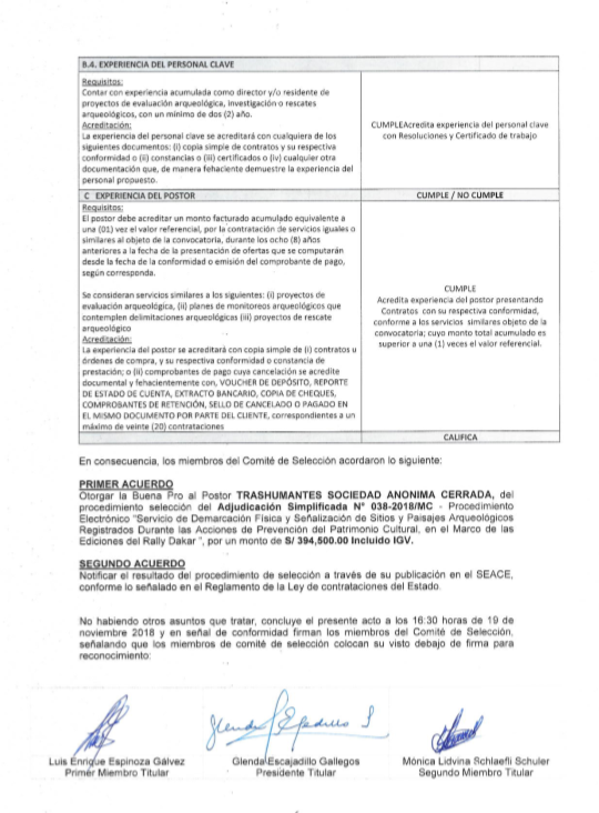 Dicho y hecho: el 19 de noviembre de este mes, Trashumantes SAC ganó la buena pro para el ‘Servicio de Demarcación Física y Señalización de Sitios y Paisajes Arqueológicos’ por S/ 394.500, firmado también por Glenda Escajadillo, exempleada de dicha consultora privada.