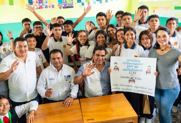 El gobernador regional, Luis Neyra León, entregó mobiliario escolar para 851 estudiantes de la Institución Educativa Santa Rita, en Morropón, esta entrega se realiza dentro del marco del equipamiento a los colegios de todas las provincias del departamento que ha emprendido la autoridad regional.