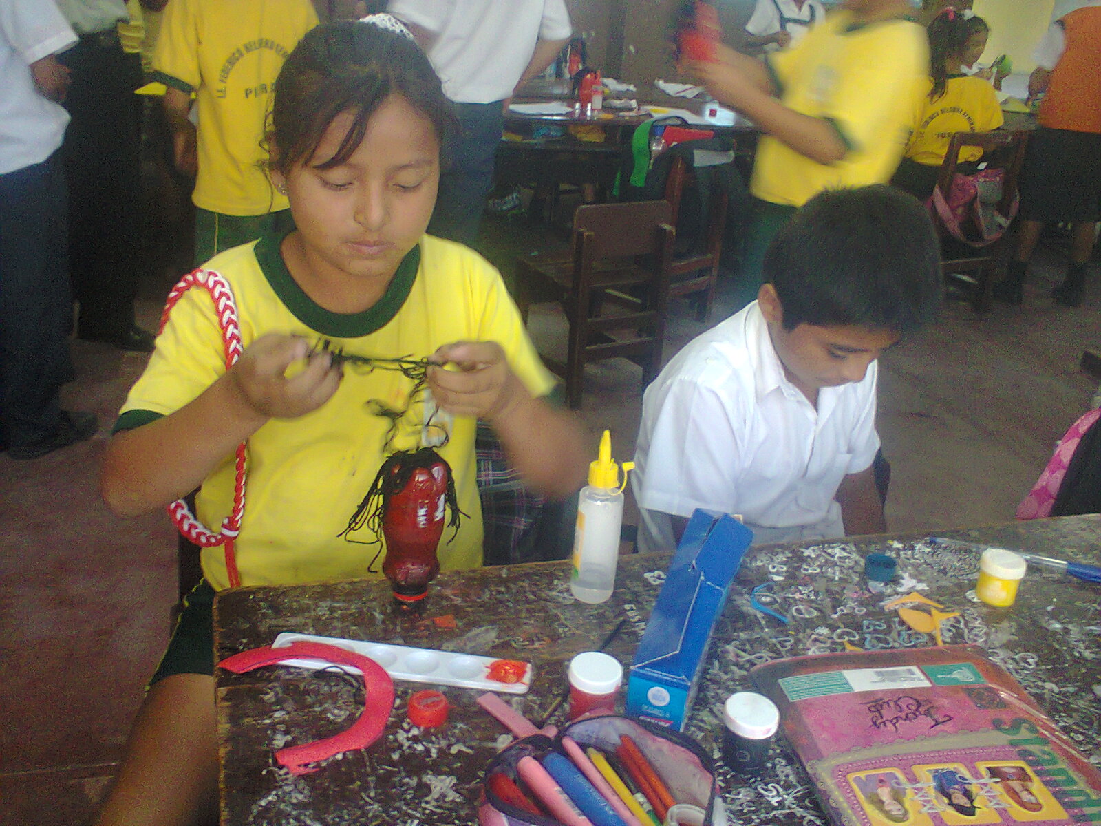 Una vez escogido el texto narrativo de acuerdo al propósito pedagógico, se pidió a los estudiantes que consigan material de reciclaje (una botella de plástico – la más pequeña de gaseosa que pudieran encontrar, retazos de tela, hilo, agujas, tijeras, silicona, algodón, lana, botones, témperas, pinceles, etc), pero sin decirles para qué, se generó expectativa, ¡Era una verdadera sorpresa!