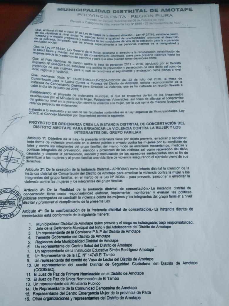De acuerdo a la establecido en la ordenanza municipal N° 008-2019, la Municipalidad de Amotape, en Piura, en coordinación creó la Instancia de Concertación distrital para erradicar la violencia contra la mujer y los integrantes del grupo familiar.