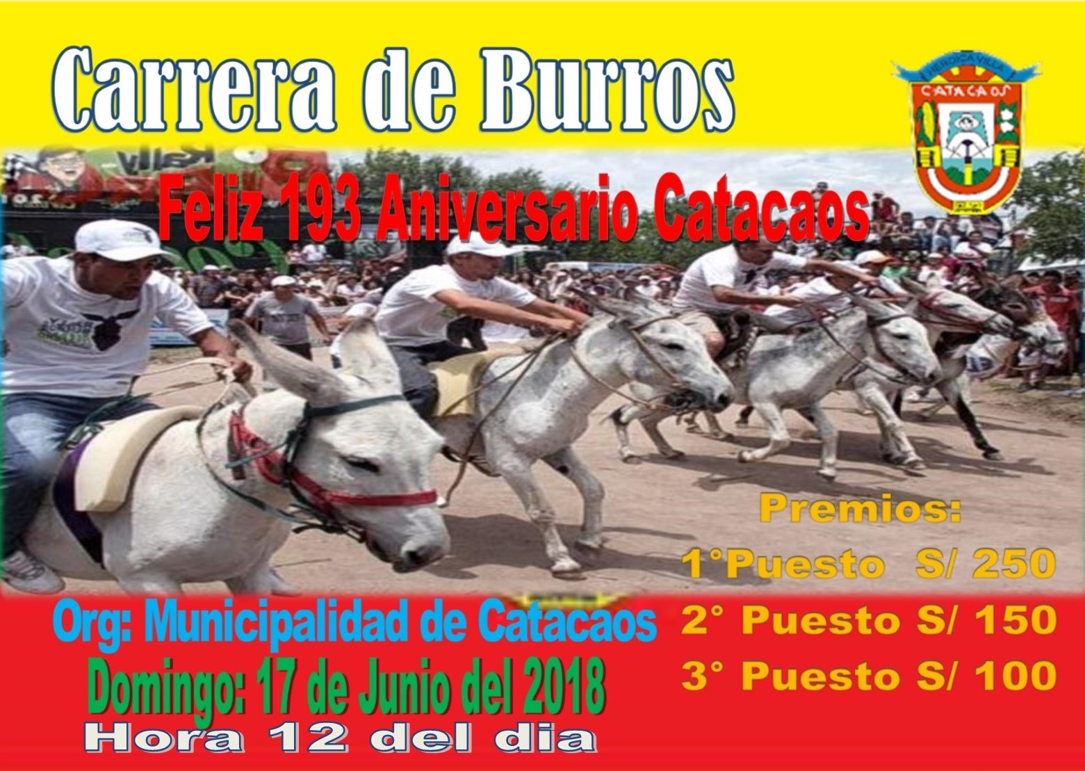Este domingo 17 de junio será la tradicional carrera de burros en la Plaza de Armas de Catacaos por el aniversario N° 193 de este distrito piurano. “La carrera de piajenos se realizará en el perímetro de la Plaza de Armas”, señaló el jefe de la Oficina de Turismo.