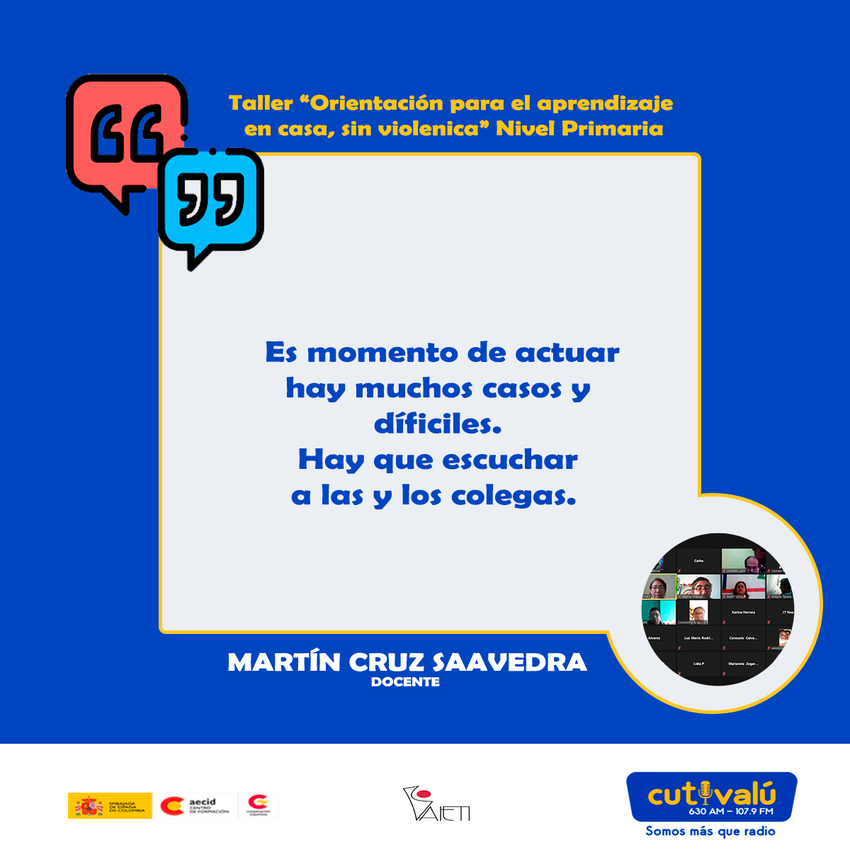 El tema de orientación para las y los educadores fue la contención emocional que se le brindan a sus estudiantes y en especial en esta situación de emergencia, donde niñas y niños están expuestos a estrés y casos de violencia en el hogar.