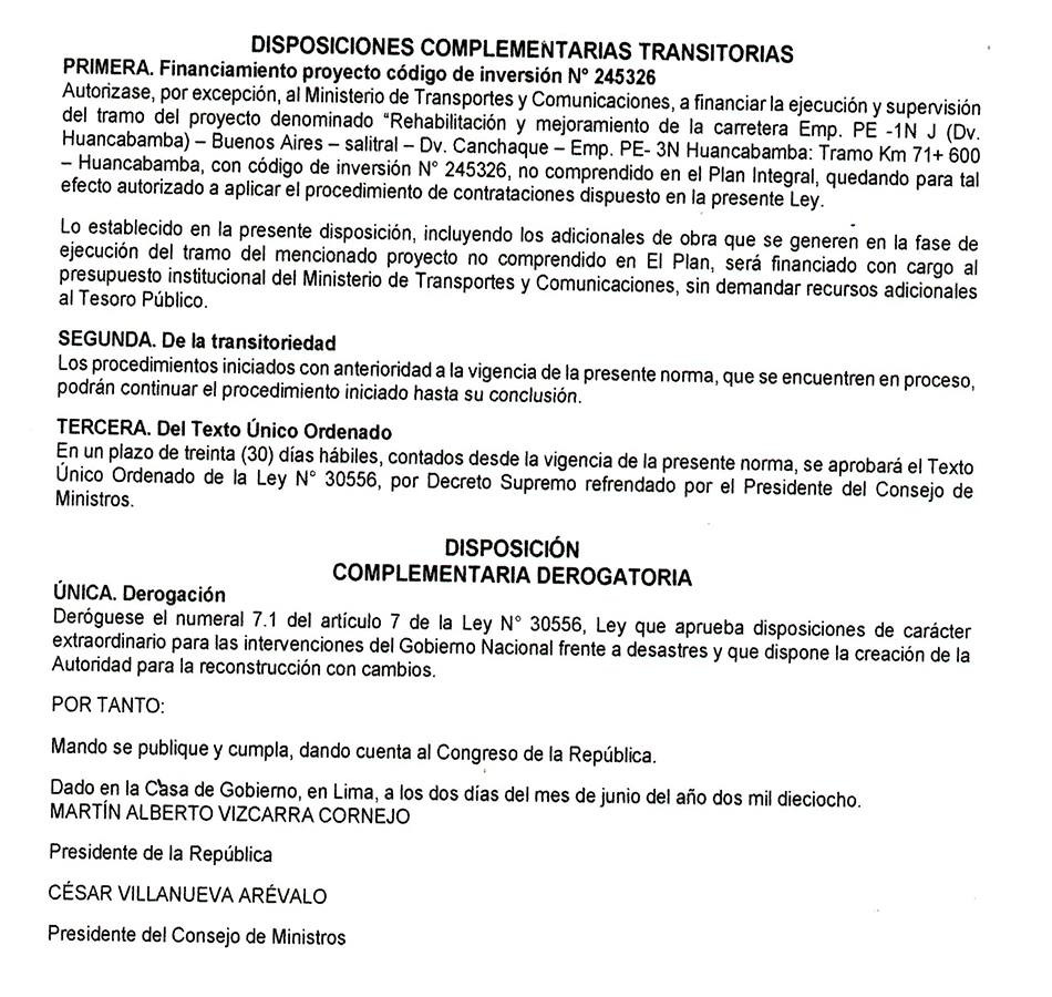 Este decreto modifica la ley N°30556, ley que aprueba disposiciones de carácter extraordinario para las intervenciones del gobierno nacional frente a desastres y que dispone la creación de la autoridad para la reconstrucción con cambios, según el diario El Peruano.