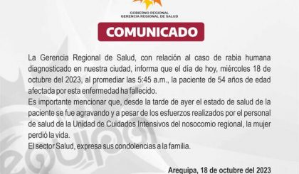 Mediante comunicado oficial, la Gerencia Regional de Salud de Arequipa informó que la paciente de 54 años diagnosticada con rabia humana falleció la madrugada de este miércoles. La mujer se encontraba en la Unidad de Cuidados Intensivos (UCI) del Hospital Honorio Delgado y su situación se fue agravando en las últimas horas.