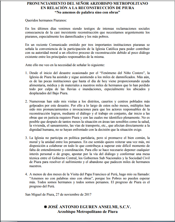 A través de un comunicado monseñor José Antonio Eguren Anselmi pide la reconstrucción de Piura.