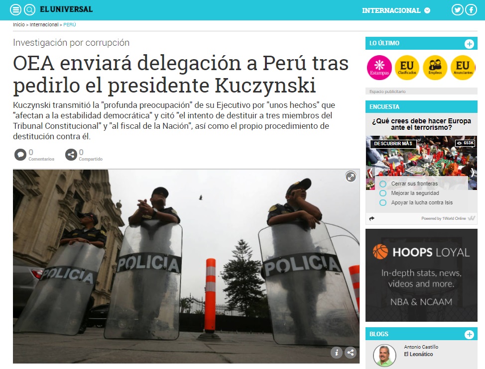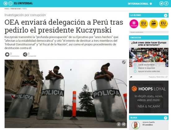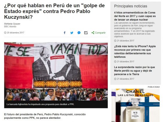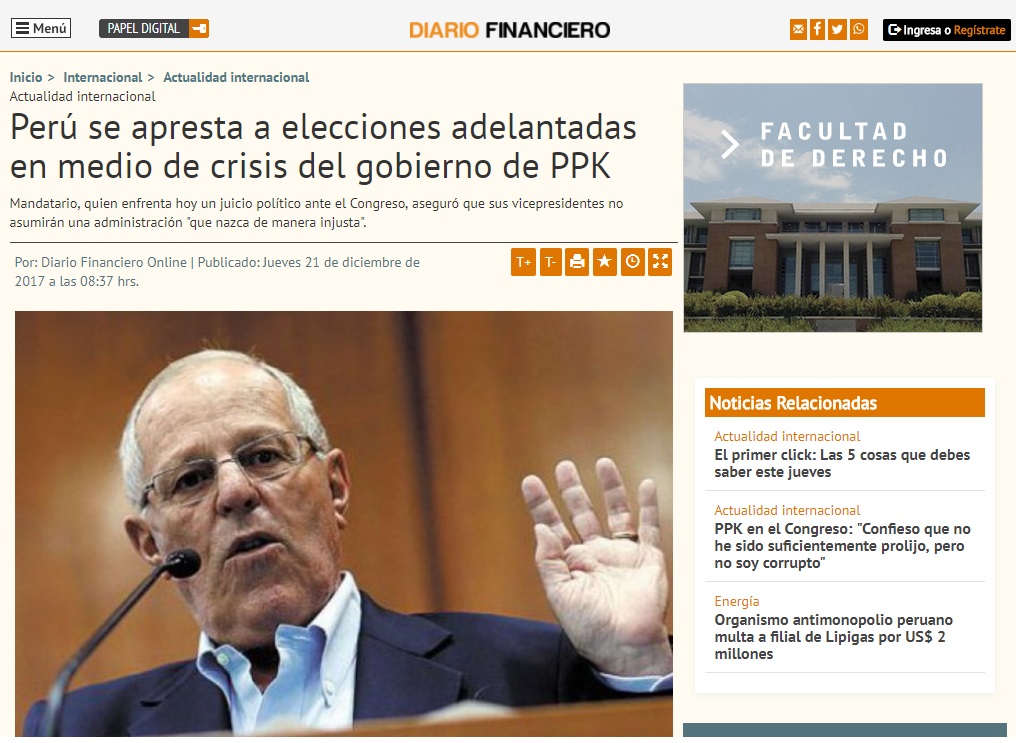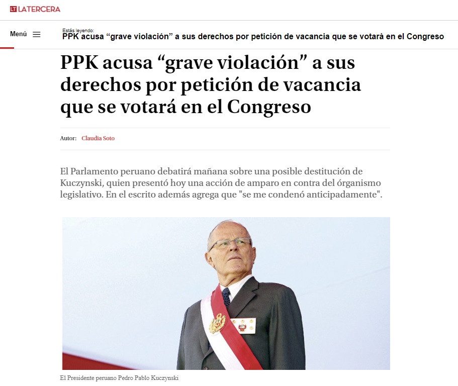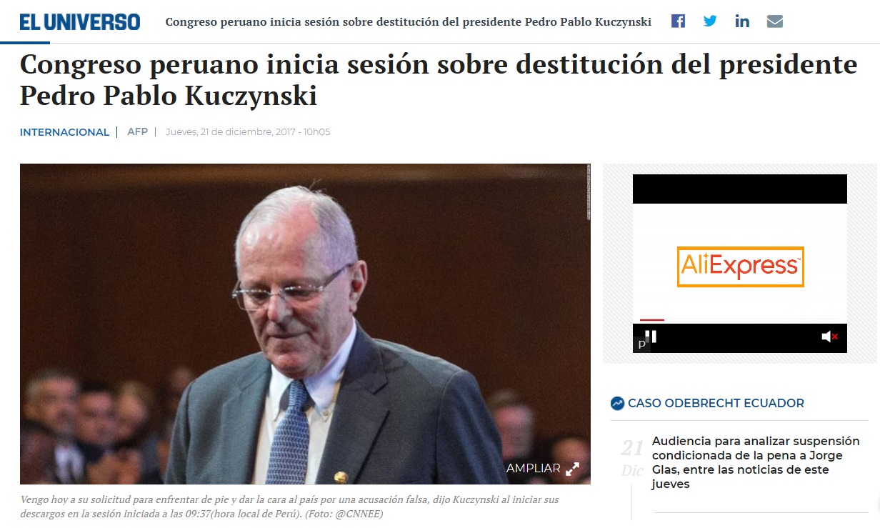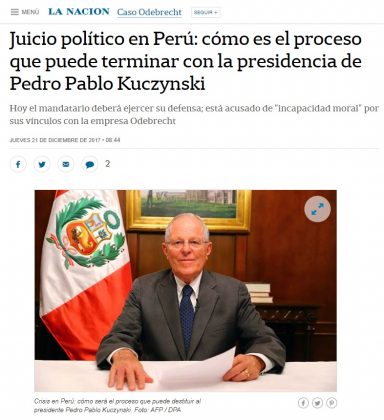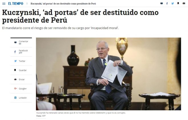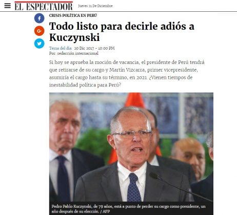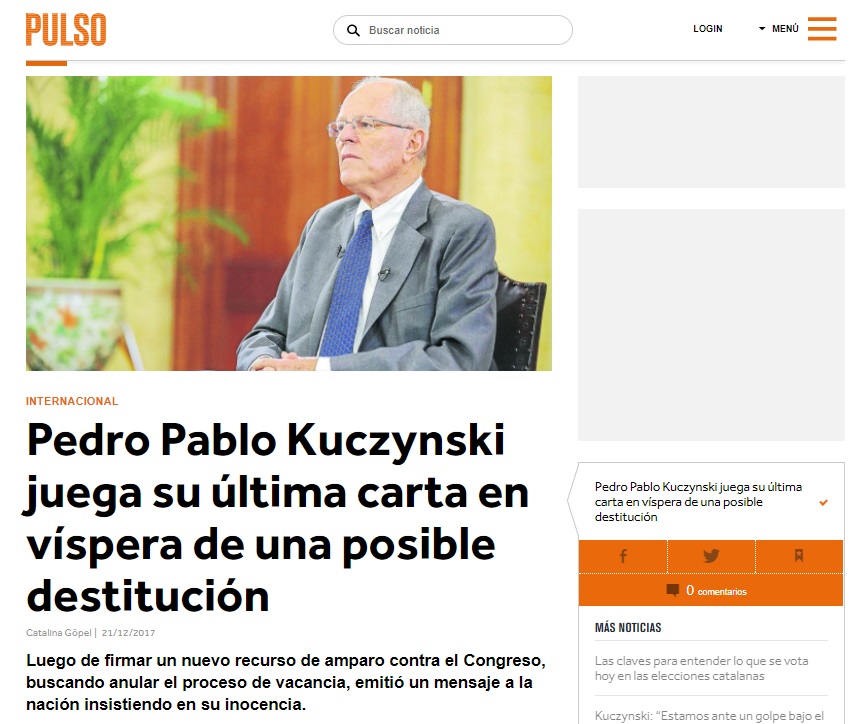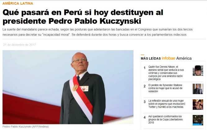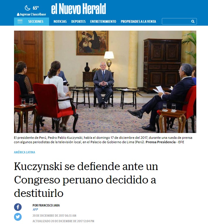 Los medios de comunicación extranjeros vienen informando sobre el proceso de vacancia contra el presidente Pedro Pablo Kuczynski (PPK), un tema que ha concitado la atención especialmente en los países latinos por las consecuencias que tendría en el Perú.