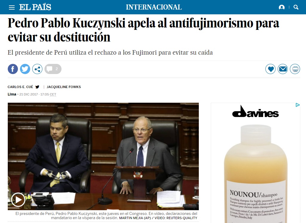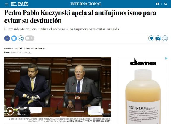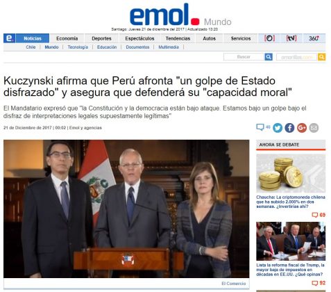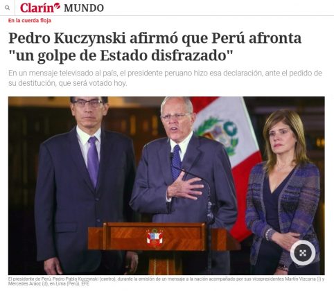 El País (España) titula que PPK «apela al antifujimorismo» para evitar su destitución, mientras que el portal norteamericano El Nuevo Herald informa sobre la defensa del presidente. En tanto, medios argentinos como La Nación, Clarín e Infobae hablan de un «juicio político», «un golpe de Estado disfrazado» y «qué pasará si hoy destituyen al presidente Kuczynski», respectivamente.