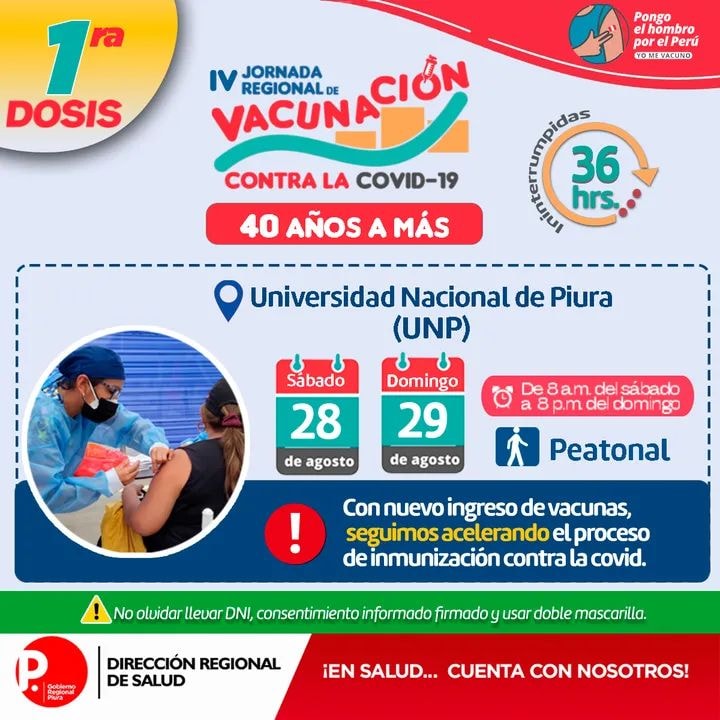 En Piura, el único centro de vacunación para la aplicación de la primera dosis de este grupo poblacional será la Universidad Nacional de Piura (UNP), en la modalidad peatonal. Este local atenderá 36 horas continuas: desde las 8 de la mañana de este sábado hasta las 8 de la noche del domingo.