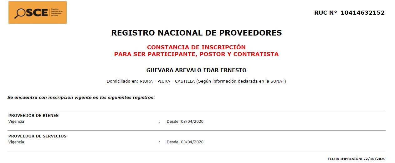 Según el Registro de Proveedores del Estado ante el Organismo Supervisor de Contrataciones del Estado (OSCE), Edar Guevara Arévalo, se registró apenas cuatro días antes de que se le adjudicara el contrato.