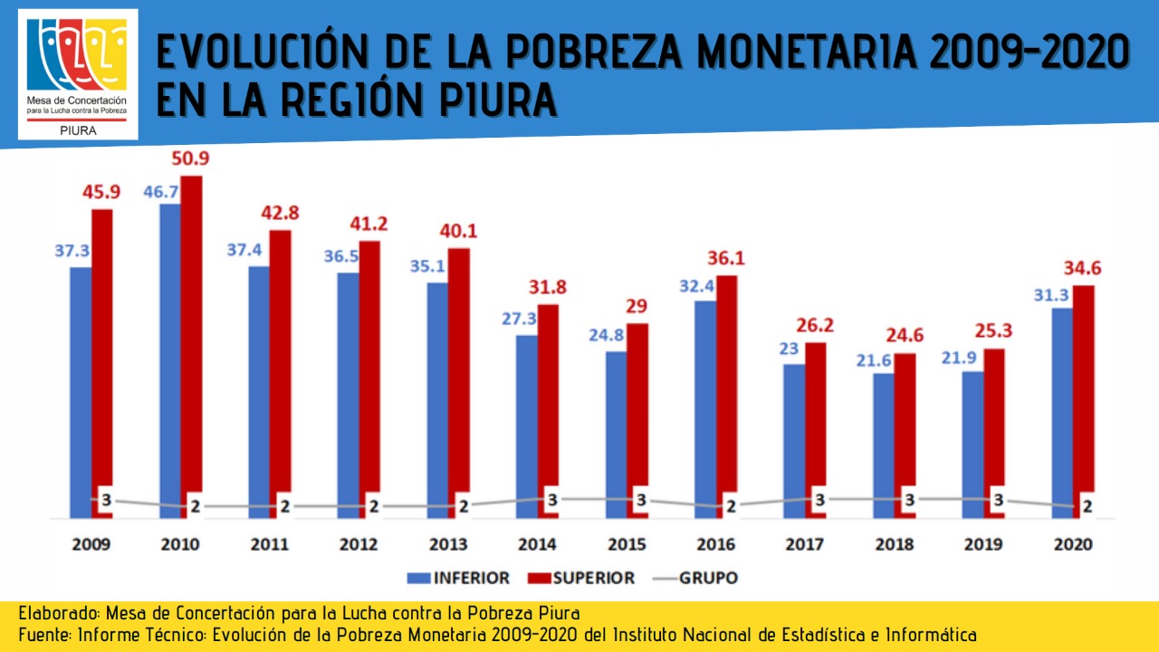 Antes de la pandemia de la Covid-19, la región Piura-que no termina de recuperarse del impacto de El Niño Costero- había reducido ligeramente sus índices de pobreza monetaria de 26,2% en 2017 a 25,3% en 2019. Sin embargo, tras la crisis sanitaria estas cifras volvieron a incrementarse y ahora se ubica dentro del segundo grupo de regiones con mayores índices de pobreza monetaria en un rango de 31.3% a 34.6%, según el último informe publicado por el Instituto Nacional de Estadística e Informática (INEI) en mayo de 2021.