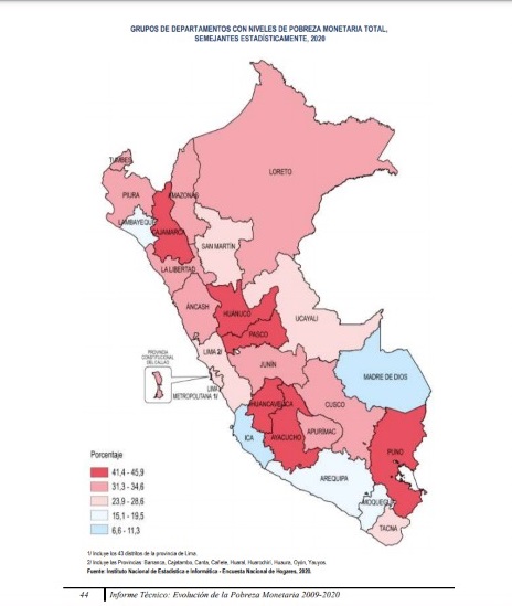 En este grupo también se ubican las regiones Amazonas, Áncash, Apurímac, Cusco, Junín, La Libertad, Loreto, la Provincia Constitucional del Callao y Tumbes. Mientras que el primer grupo de regiones más pobres del país está conformado por Ayacucho, Cajamarca, Huancavelica, Huánuco, Pasco, Puno, cuya pobreza monetaria se ubica en el rango entre 41,4% a 45,9%.