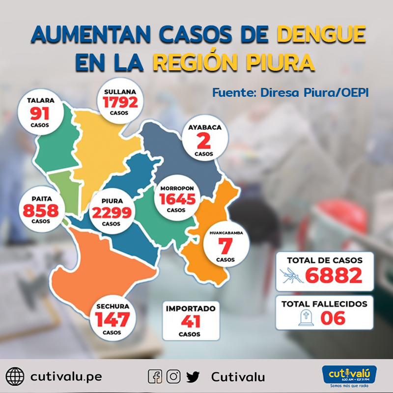 La provincia con más casos es Piura con 2 mil 299 casos, le sigue Sullana con mil 792, Morropón con mil 645 y Paita con 858. La provincia de Sechura presenta 147 pacientes, Talara 91, Huancabamba 7 y Ayabaca 2.