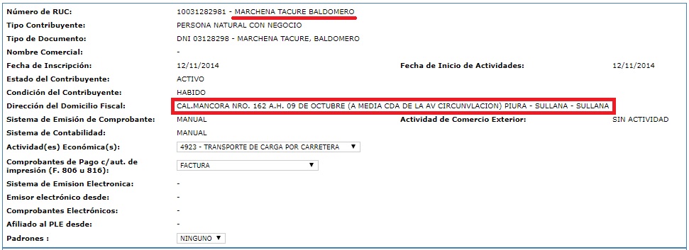 Ficha RUC de Baldomero Marchena, hijo del alcalde.
