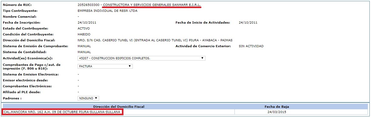 Ficha RUC de «Niño Dios», la empresa de Baldomero Marchena.
