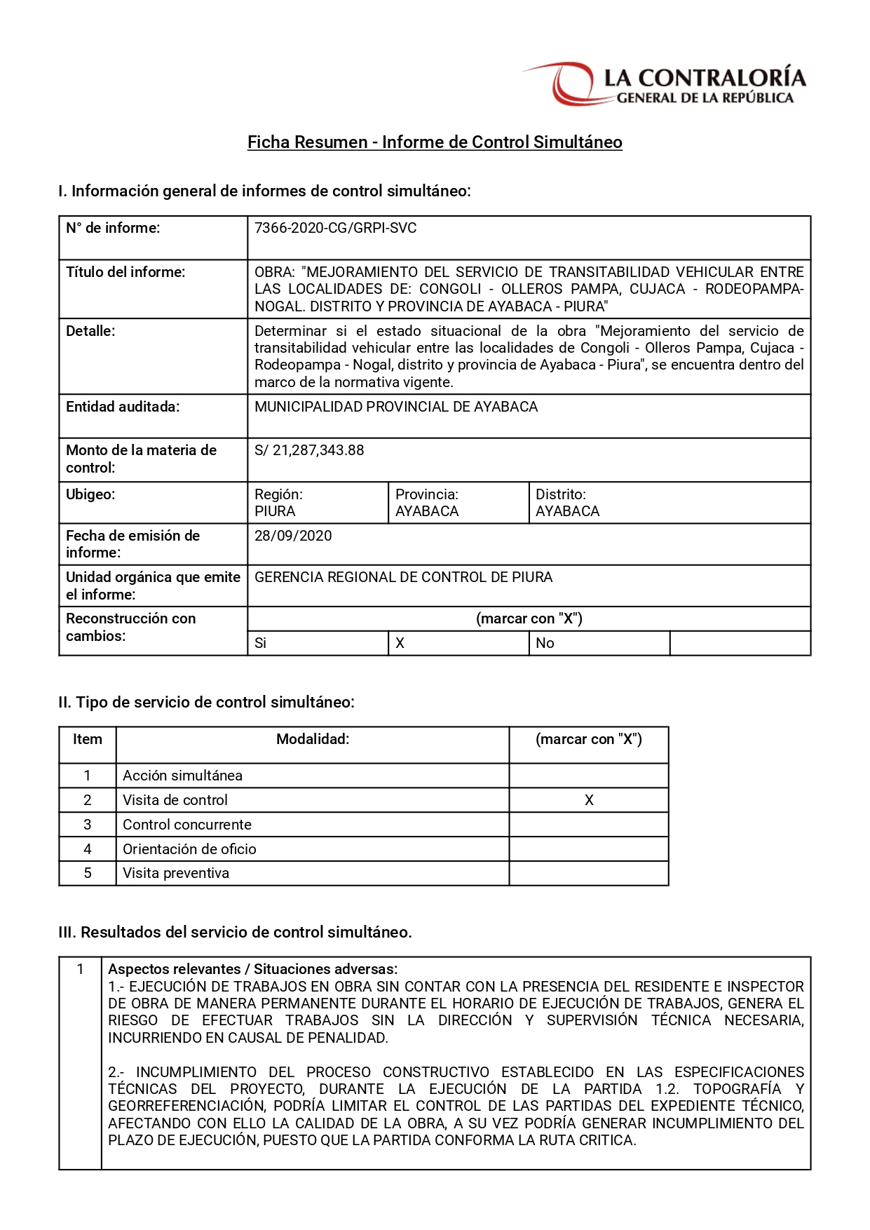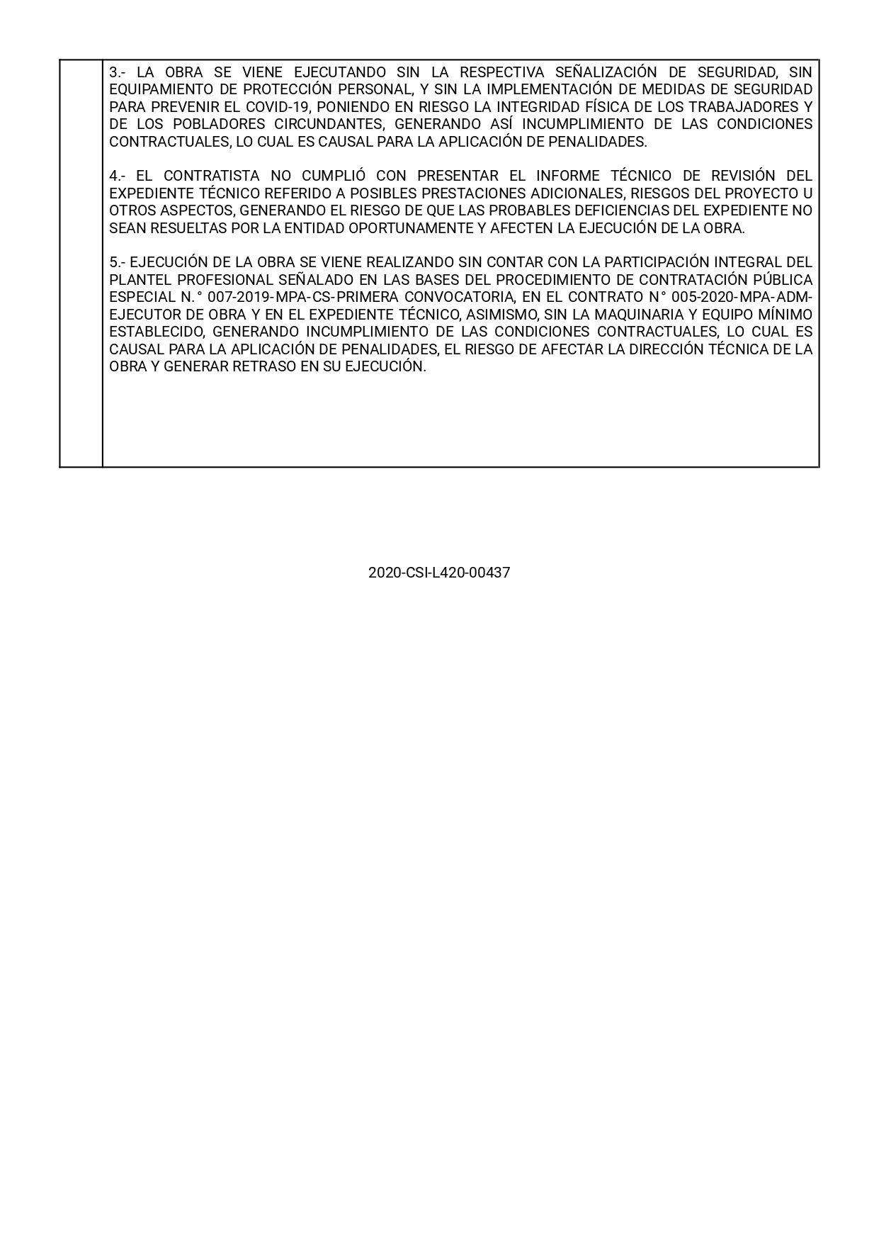 Esta situación ya había sido advertida previamente por la Contraloría, en setiembre del 2020, tal como consta en el informe N° 7366-2020, donde da cuenta de la ejecución de trabajos sin contar con la presencia del residente ni el inspector de obra de manera permanente, generando el riesgo de efectuar trabajos sin la dirección y supervisión técnica necesaria, incurriendo en causal de penalidad.