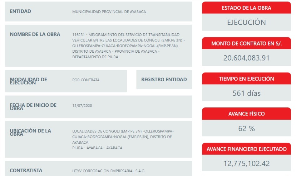 La obra que menciona don Jaime Ramos es el “Mejoramiento del servicio de transitabilidad vehicular entre las localidades Congolí – Olleros Pampa – Cujaca – Rodeopampa – Nogal”, a cargo de la municipalidad de Ayabaca y valorizada en 20 millones 604 mil 83.91 soles.