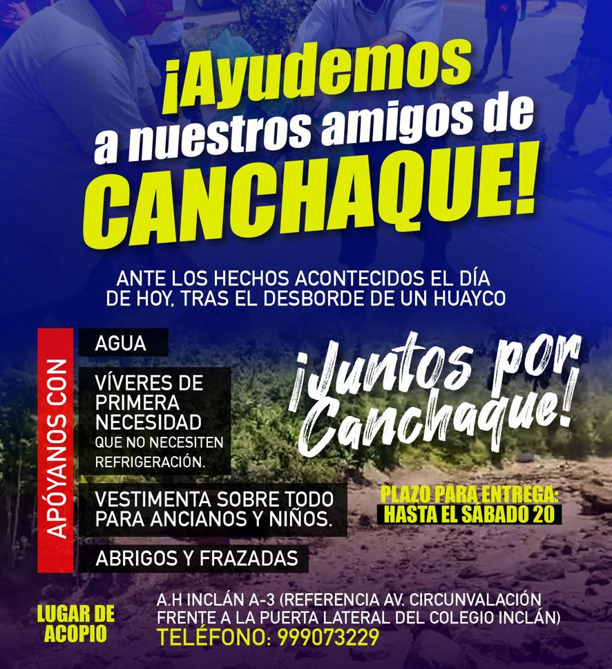En Piura hay iniciativas de colectas para llevar ayuda. Una de ellas es la promovida por ciudadanos canchaqueños que viven en Piura y que están recibiendo todo tipo de ayuda hasta este sábado 20, con el fin de trasladarla a Canchaque el domingo 21.