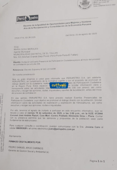 El hecho se conoció a través de un documento que Perupetro envió a la Municipalidad de El Tallán. De acuerdo al escrito, enviado el pasado 25 de agosto, la institución invita a la comuna a ser parte de un evento de participación ciudadana, previo a la contratación del lote 208.