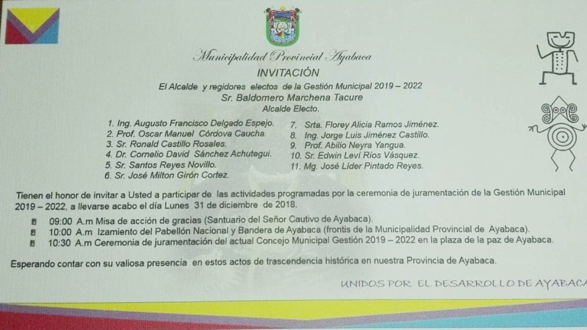 El alcalde electo de Ayabaca, Baldomero Marchena Tacure, decidió que su ceremonia de juramentación sea este lunes 31 de diciembre del 2018 a partir de las 10:30 de la mañana en la Plaza de la Paz de la ciudad.