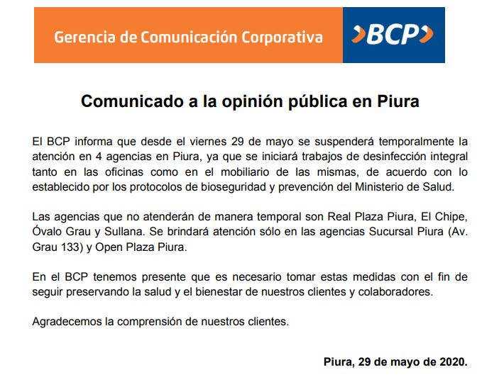 A través de un comunicado, el BCP informa que desde hoy viernes 29 de mayo se suspenderá temporalmente la atención en 4 agencias en Piura, ya que se iniciará trabajos de desinfección integral tanto en las oficinas como en el mobiliario de las mismas, de acuerdo con lo establecido por los protocolos de bioseguridad y prevención del Ministerio de Salud.
