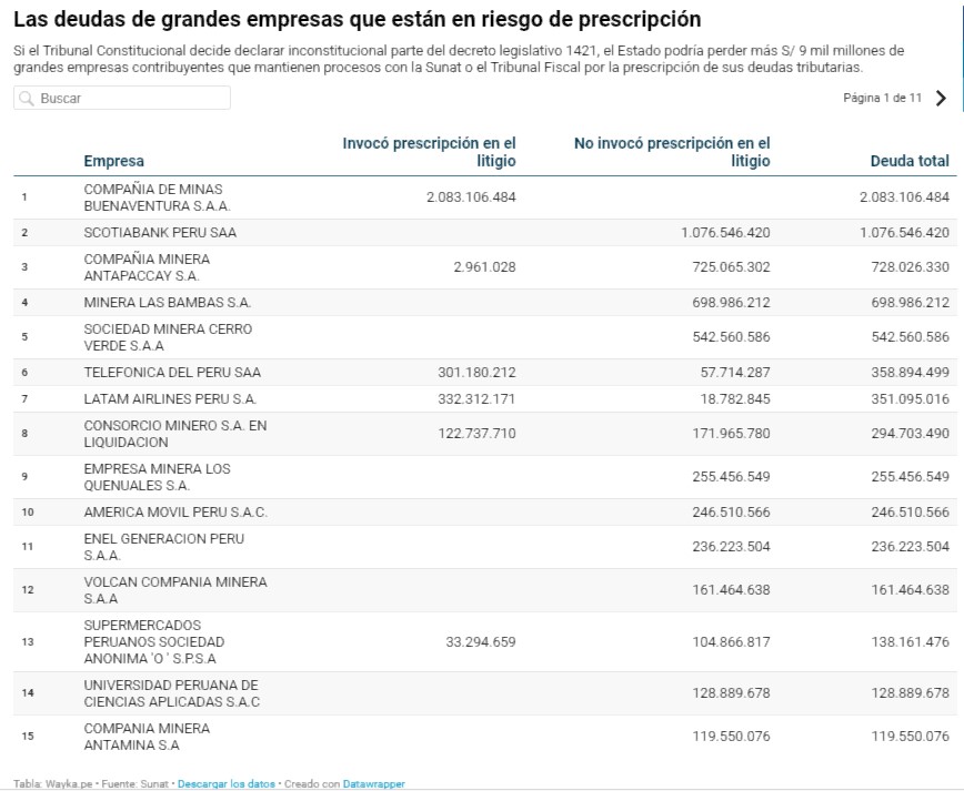 Las principales beneficiadas serían 158 empresas deudoras, con la minera Buenaventura a la cabeza. ¿Por qué? La demanda sobre la que decidirá el Tribunal Constitucional busca que se declare inconstitucional una disposición del Decreto Legislativo 1421 vinculada al cálculo del plazo de prescripción de deudas tributarias.