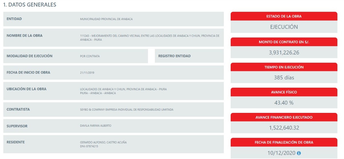 Como se sabe, la obra “Mejoramiento del camino vecinal entre las localidades de Ayabaca y Chilín”, a cargo de la municipalidad de Ayabaca, se encuentra valorizada en 3 millones 931 mil 226.26 soles. Los trabajos los ejecuta Seybo & Company Empresa Individual de Responsabilidad Limitada, con un plazo de 385 días calendarios, que inició en noviembre de 2019 y debió ser entregada en diciembre de 2020.