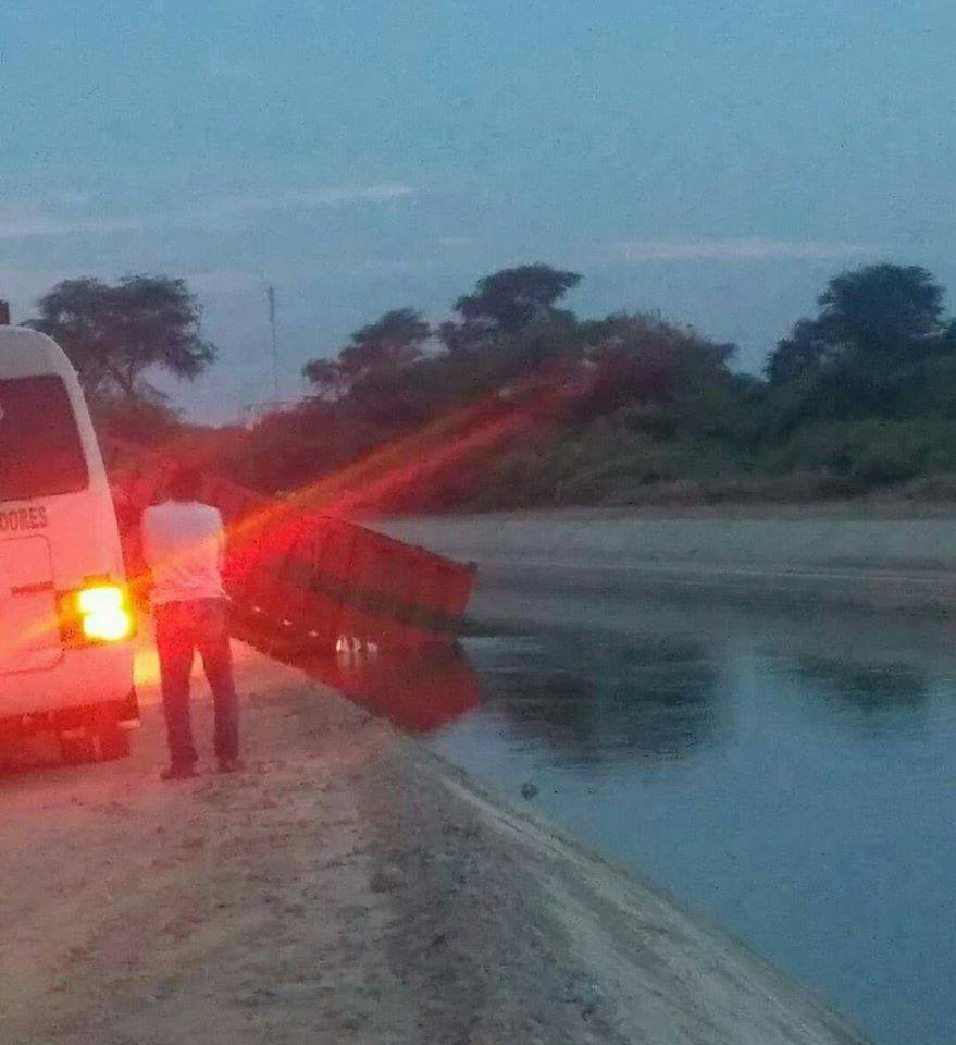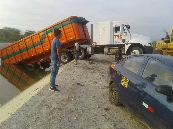 Esta madrugada cayó un camión volquete al canal Biaggio Arbulú a la altura de San Jacinto- La Legua cuando se trasladaba por la trocha carrozable en mal estado que deben usar miles de transportistas y pasajeros debido al cierre del puente Independencia.