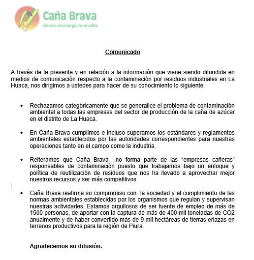 Tras la denuncia de contaminación por residuos industriales en el distrito de La Huaca, en Paita, la empresa Caña Brava emitió un comunicado rechazando el generalizar la responsabilidad de la contaminación ambiental a todas las empresas del sector de producción de la caña de azúcar.