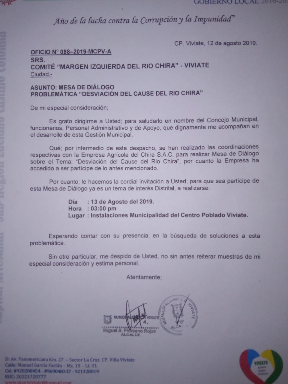 El alcalde del centro poblado de Viviate, Miguel Floreano Rojas, señaló que no cederán ante el pedido de Caña Brava de mantener el dique. “Nuestra posición es que la empresa debe retirar el muro que ellos has puesto en medio del río. Esperamos que mañana [martes] la empresa entienda y no siga cometiendo estos abusos, ya que no es la primera vez que lo hace”, señaló la autoridad.