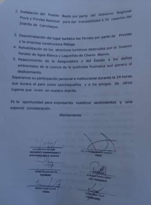 La medida de fuerza es liderada por miembros del Comité de Damnificados y Afectados de Canchaque. En su pliego reclamos advierten su preocupación por el peligro de sufrir una nueva emergencia como la del pasado 17 de marzo con el desprendimiento del depósito 111.