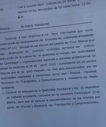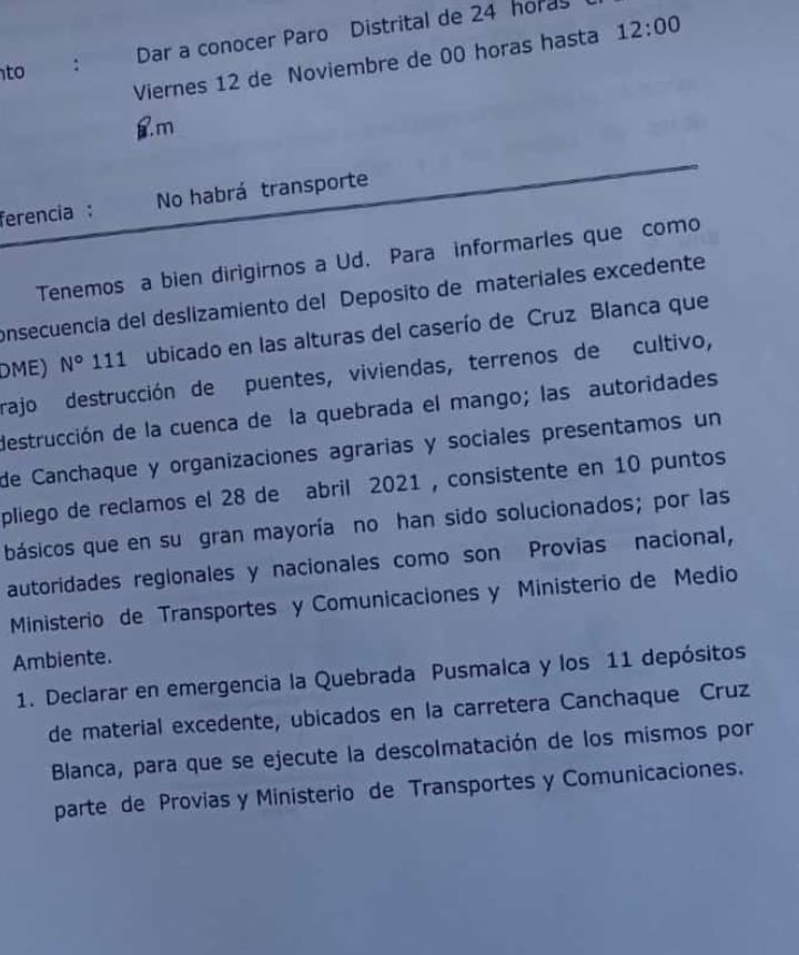 El dirigente advirtió que, de no llegar a acuerdos, ejecutarán el paro anunciado. De esta forma, la provincia de Huancabamba quedará incomunicada producto del bloqueó de la vía principal.