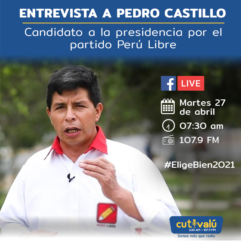 Pedro Castillo Terrones brindará una entrevista a Cutivalú este martes 27 de abril a las 7:30 de la mañana, donde hablará sobre su plan de gobierno y sus propuestas en caso llegue a ser Presidente del Perú. Puedes verla a través de el facebook live y sintonizarla a través de nuestra radio.