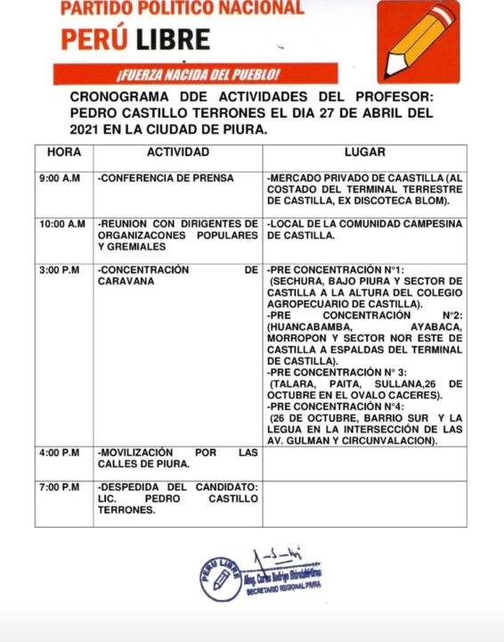 Según su cronograma, el candidato del lápiz tiene programado realizar una conferencia de prensa a las 9:00 am. A las 10 am tendrá una reunión con dirigentes de organizaciones populares y gremiales de Piura. Finalmente recorrerá diversas calles de la ciudad en una caravana.