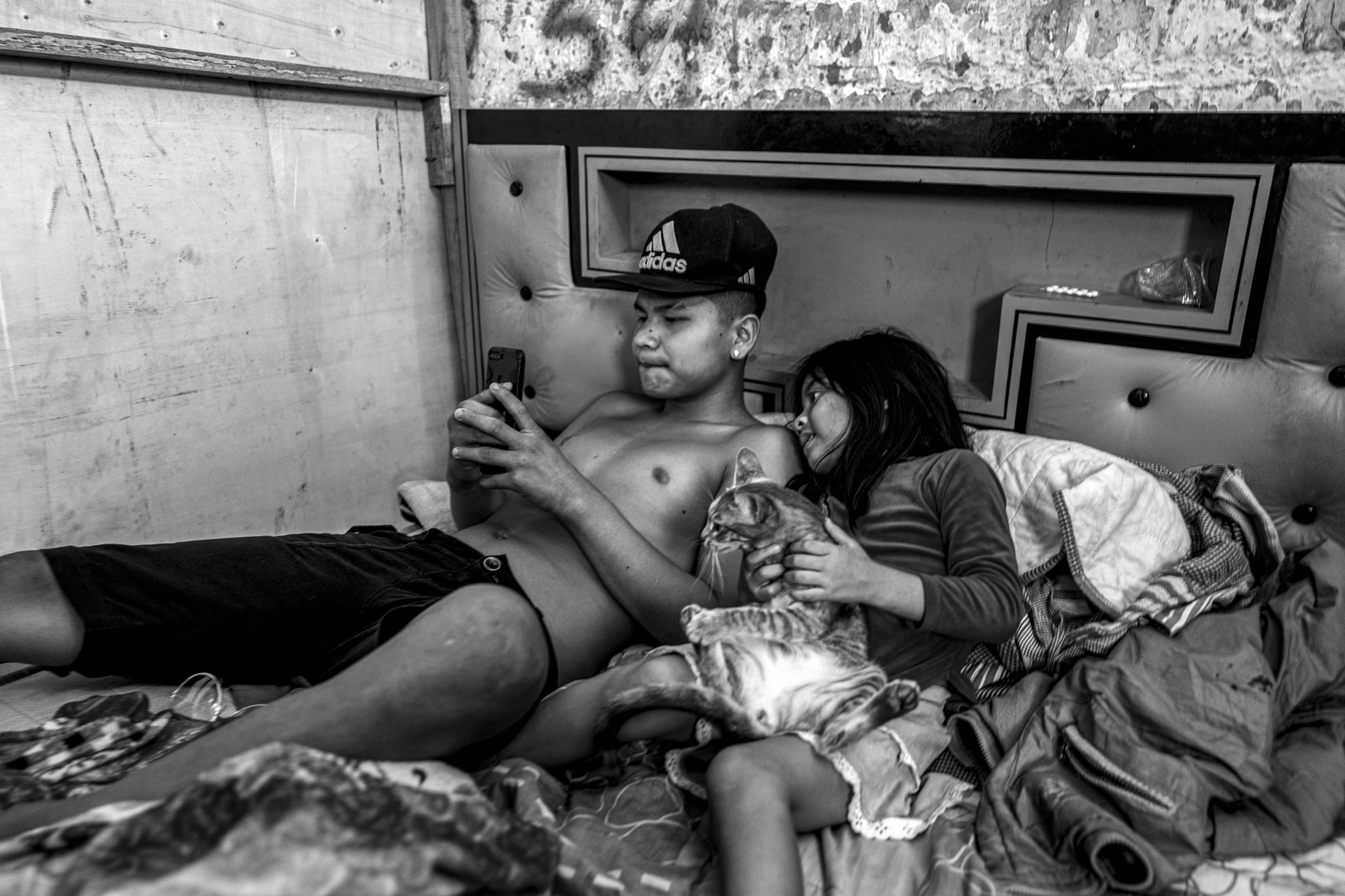 PASATIEMPO. Dos hermanos se entretienen con un celular para sobrellevar la cuarentena en una de las viviendas de Cantagallo.