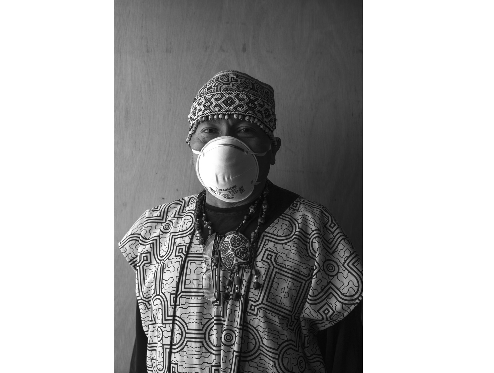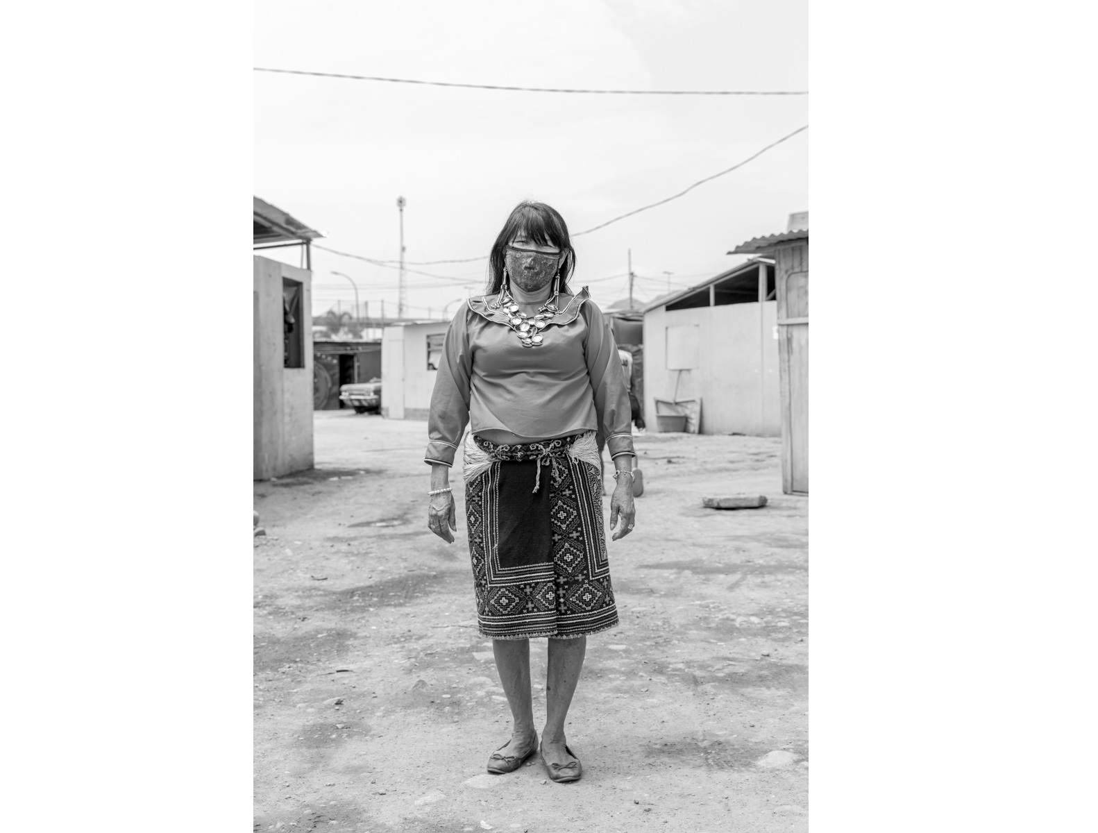 Olinda Silvano, artista Shipibo-Konibo. / ADAPTACIÓN. La reconocida artista Olinda Silvano en los exteriores de su vivienda. Lleva una mascarilla de tela con diseño tradicional, la cual lava y reutiliza para protegerse.