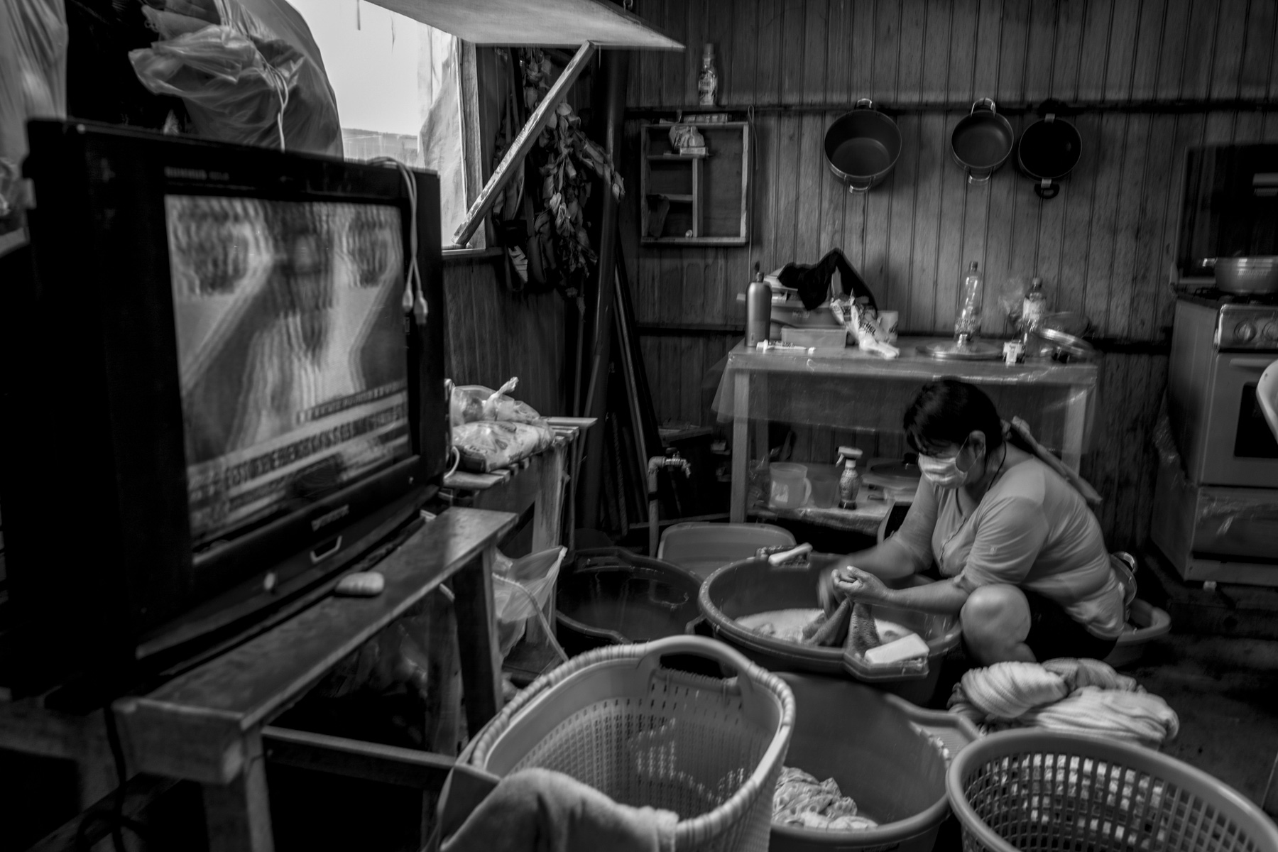 TAREAS. Una vecina lava la ropa mientras escucha uno de los reportes diarios del Presidente sobre la evolución del número de afectados y las medidas para contener los contagios.