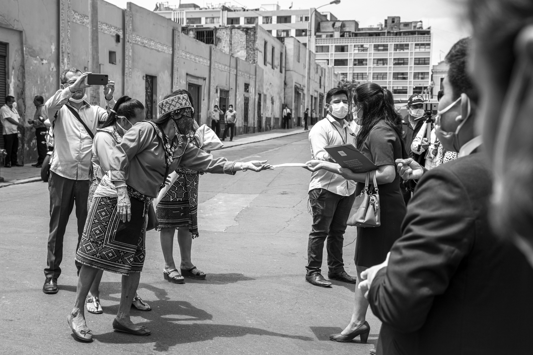 MEMORIAL. Karina Pacaya, presidenta de la Asociación Comunidad Urbano Shipibo-Konibo de Lima Metropolitana acude con un grupo de líderes al Congreso para presentar un pedido de apoyo frente a la amenaza del coronavirus.