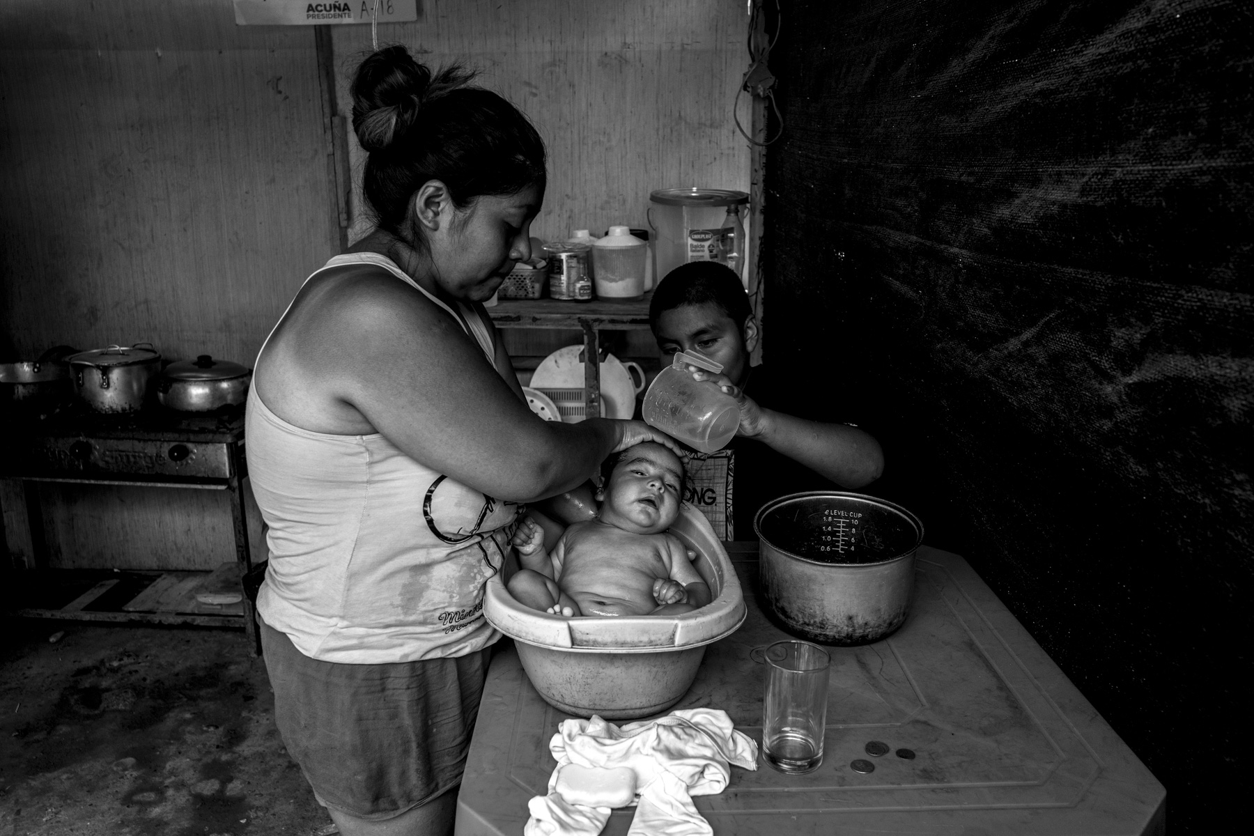 BAÑO. Una madre de familia asea a su bebé con la ayuda de su hijo. Debido a que no cuenta con servicio de agua ni desagüe en casa, tiene que usar una olla y una batea.