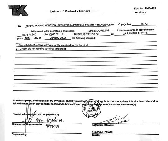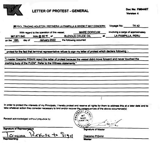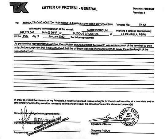 “Protesto porque el representante de la terminal (de Repsol) se niega a firmar mi carta de protesta que señala lo siguiente: El capitán Giacomo Pisani rechaza esta carta de protesta (de Repsol) porque el buque no avanzó y nunca tocó la boya de señalización del PLEM (infraestructura de metal de recolección y distribución submarina, que permiten el paso de los hidrocarburos para la recepción o despacho del mismo). Consulten las declaraciones de los testigos”.
