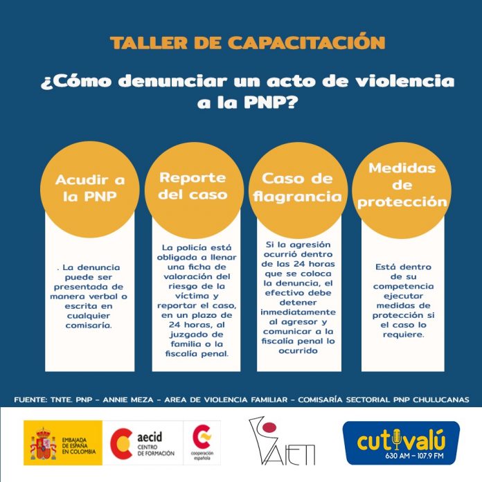 En esta oportunidad se logró reunir a las beneficiarias del programa de comedores populares del distrito de Chulucanas, a través de la aplicación de WhatsApp. La sesión inició con el audio de la Tnte. PNP Annie Meza, jefa del área de violencia familiar de la comisaría de Chulucanas, cuyo mensaje de voz enviado detalla el procedimiento que debe seguir la víctima de violencia para denunciar su agresión en el marco de la Ley 30364.